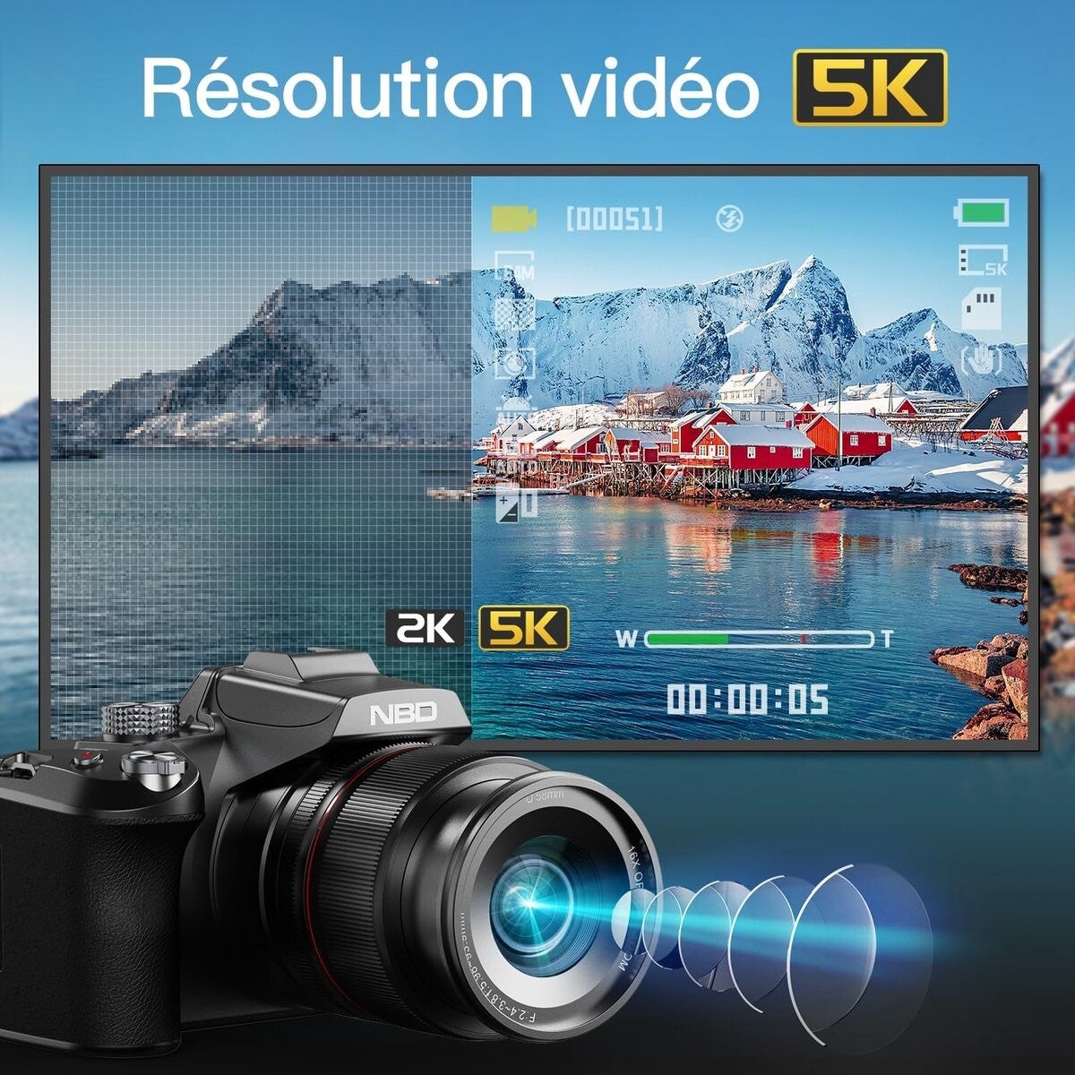 NBD 5K digitale camera 64MP - 16x zoom - 5K video - wifi app - 32GB kaart + 2 batterijen