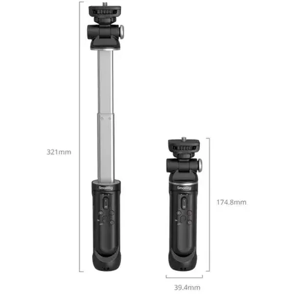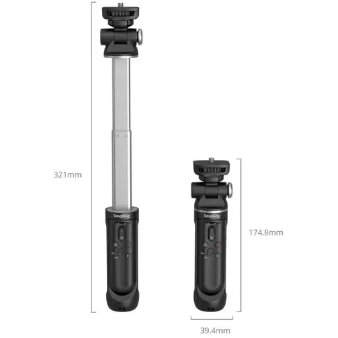 Deze grip wordt aan de camera bevestigd met 1/4"-20 schroeven, met rubberen pads op de houder om krassen op de camera te voorkomen. Hij kan ook worden omgevormd tot een statief, ter ondersteuning van camera's op een desktop tijdens livestreamen of filmen. Met een draagvermogen van 1,5 kg wanneer niet uitgeklapt en 0,8 kg wanneer uitgeklapt, biedt de grip stabiele ondersteuning voor verschillende cameramodellen. De afstandsbediening heeft een USB-C-oplaadpoort, waardoor hij in 2,5 uur volledig kan worden opgeladen, wat tot 40 uur gebruik oplevert. Bovendien kan hij worden geüpgraded via de SmallRig Up-app voor bredere cameracompatibiliteit.